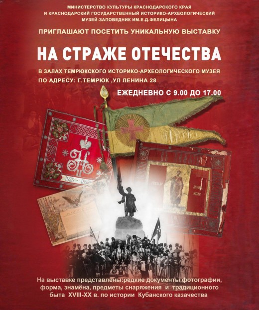 На данной выставке представлены уникальные и редкие экспонаты: знамена полков Кубанского казачьего войска, форма и оружие казаков, предметы быта, уникальные документы и фотографии. Экспозицию дополняют красочные планшеты,которые рассказывают об освоении казаками кубанских земель, героических страницахЧитать полностью