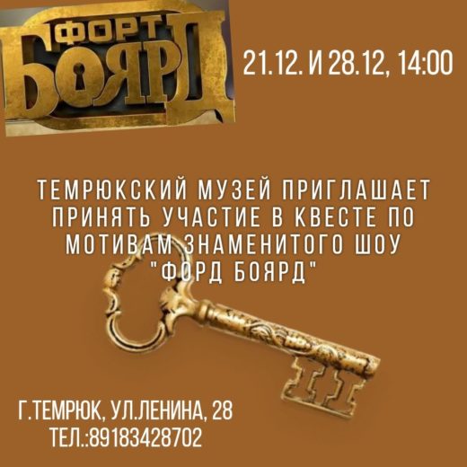 Темрюкский музей: 25 декабря 19:00 «Тайна одного экспоната». Тематическая авторская вечерняя экскурсия. 27 декабря 11:00 «Академия искусства». Мастер-класс: изготовление новогодней поделки-варежки. 28 декабря 11:00 «Академия искусства». Мастер-класс: изготовление настоящего Деда Мороза! 14:00 «Музейный Форт Боярд».Читать полностью