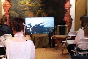 Поговорили о музыке — и она участвовала в войне — на примере экспоната — гармони капитана артиллерийских войск Павла Игнатьевича Санжаровца, с которой он прошел всю войну. Кроме того, ребята увидели уникальную кинохронику освобождения Тамани от оккупации в 1943 г.