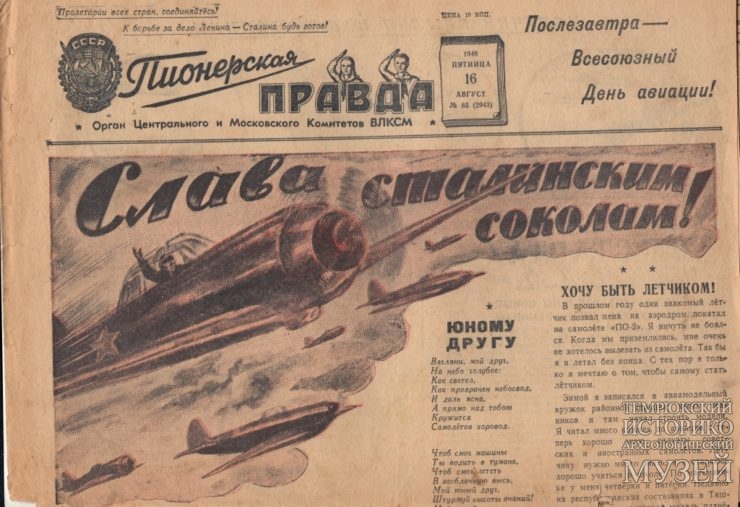 В фондах Темрюкского историко-археологического музея хранятся несколько экземпляров этой замечательной газеты. Предлагаем вашему вниманию несколько статей из номера 65 (2943) от 16.08.1946 г. — стихи, мечты о полетах, великие биографии и школьные будни ждут вас!