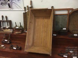 В нашей экспозиции корыто деревянное представляет собой открытую продолговатую ёмкость, расширенную кверху, изготовленную вручную из гладких плотно прилегающих досок толщиной 2 см. По бокам – ручки в виде поперечных реек. Использовали корыто по-разному, как любую ёмкость: для сбора урожая яблок, для заготовки солений, для стирки белья, купания, хранения продуктов, замеса теста, и из них кормили скот, птицу и т.д. В перевёрнутом виде использовали, как большую крышку. Корыто в хозяйстве годилось для всего и имело самое разнообразное назначение, а зимой дети катались в них с горок, как в санках. Форма их не менялась на протяжении многих лет, всегда была такая, как и сейчас ─ вытянутая в отличие от тазов и мисок, предназначение которых очень схоже, но только форма у них круглая. Корыта были разных размеров.